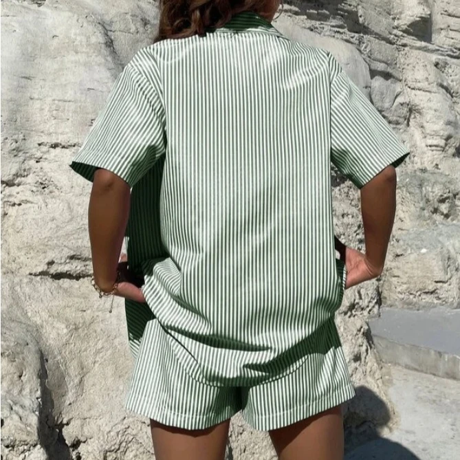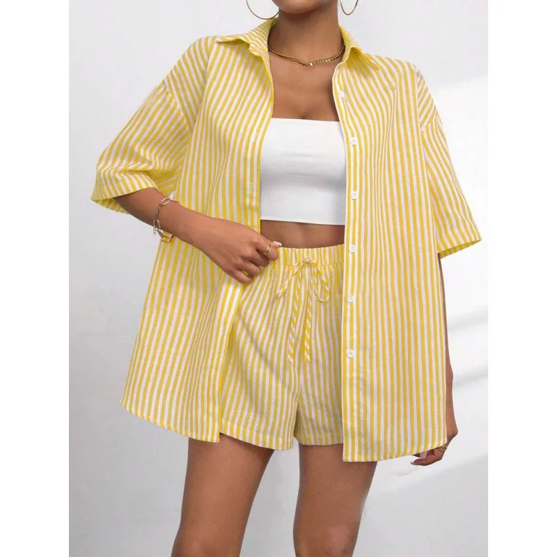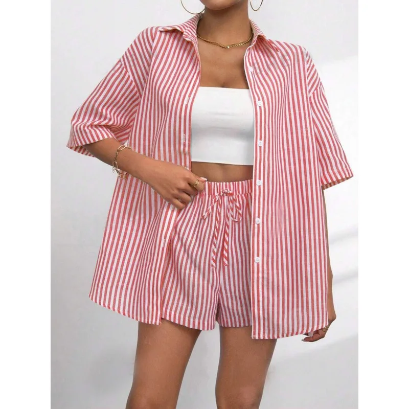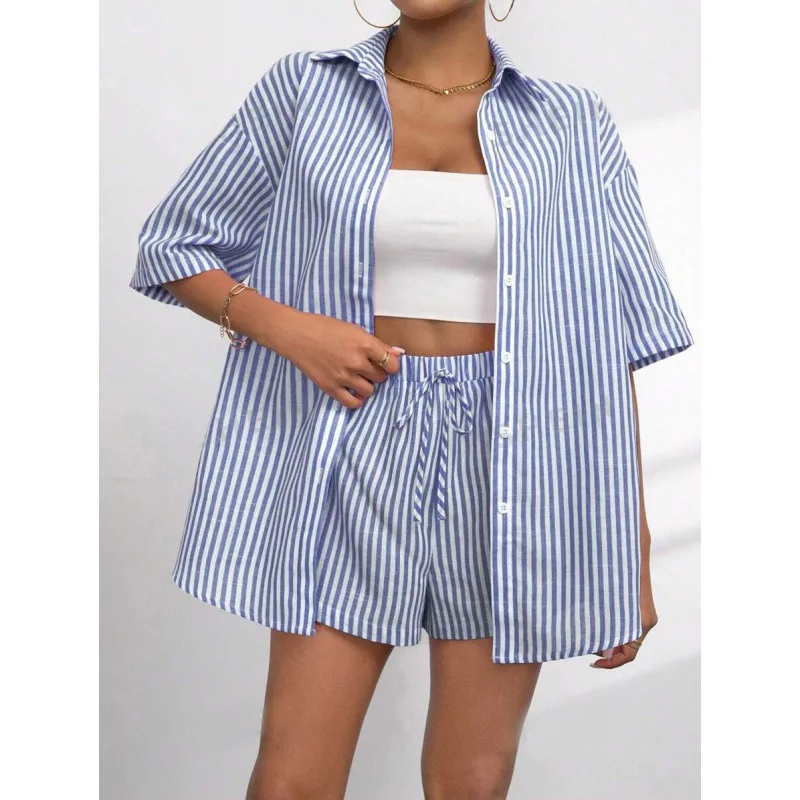 2025 Summer Striped Lady Outfit Loose Lapel Short Sleeves Single Breasted Top Elastic Waist Shorts Women Casual Shirt Shorts Set